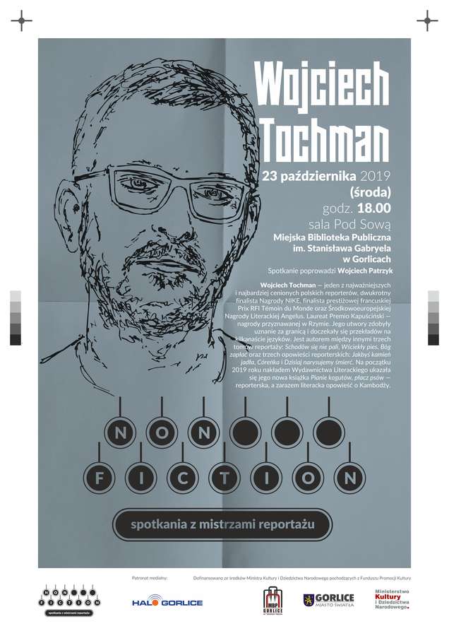 Plakat informujący o spotkaniu autorskim z Wojciechem Tochmanem, które odbyło się 23 października 2019 roku w Miejskiej Bibliotece Publicznej w Gorlicach.