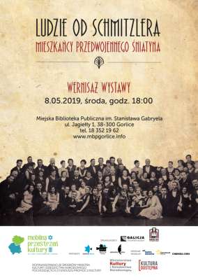 Plakat informujący o wystawie "Ludzie od Schmitzlera : mieszkańcy przedwojennego Śniatyna", która miała miejsce w Miejskiej Bibliotece Publicznej w Gorlicach, wernisaż odbył się 8 maja 2019 roku.