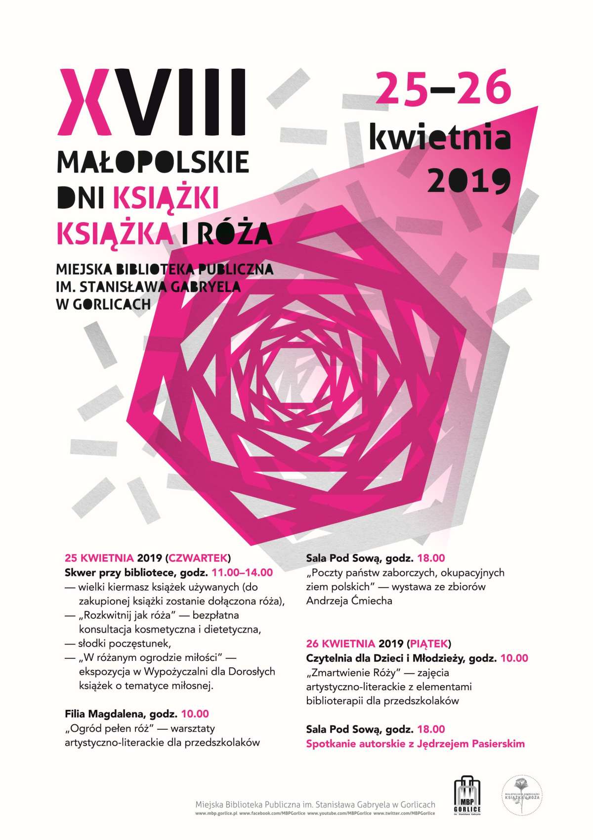 Plakat informujący o XVIII Małopolskich Dniach Książki "Książka i Róża", które odbyły się w dniach 25-26 kwietnia 2019 roku w Miejskiej Bibliotece Publicznej w Gorlicach.