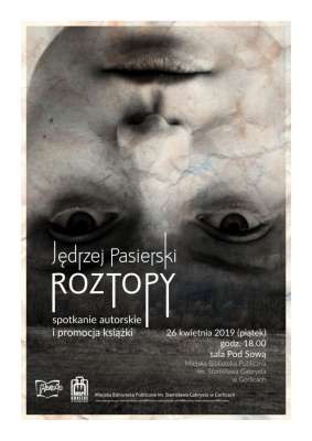 Plakat informujący o spotkaniu autorskim z Jędrzejem Pasierskim i promocji książki "Roztopy", które odbyło się 26 kwietnia 2019 roku w Miejskiej Bibliotece Publicznej w Gorlicach.