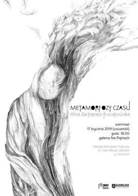 Plakat informujący o wernisażu wystawy Aliny Zachariasz-Kuciakowskiej, który odbył się 17 stycznia 2019 roku w Miejskiej Bibliotece Publicznej w Gorlicach.