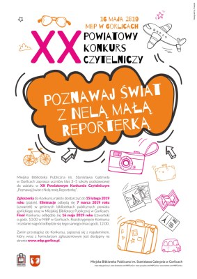 Plakat informujący o finale powiatowego konkursu czytelniczego "Poznaj świat z Nelą Małą Reporterką", który odbył się 16 maja 2019 roku w Miejskiej Bibliotece Publicznej w Gorlicach.