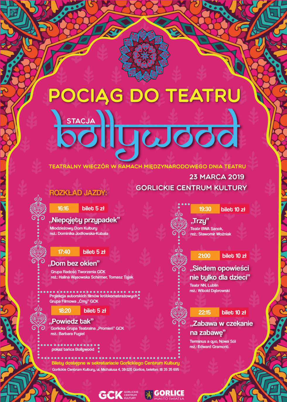 Plakat informujący o teatralnym wieczorze "Pociąg do teatru : stacja Bollywood", który miał miejsce 23 marca 2019 roku w Gorlickim Centrum Kultury.