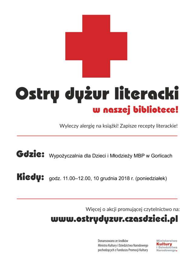 Plakat informujący o akcji czytelniczej "Ostry dyżur literacki", zorganizowanej przez Miejską Bibliotekę Publiczną w Gorlicach w dniu 10 grudniu 2018 roku.