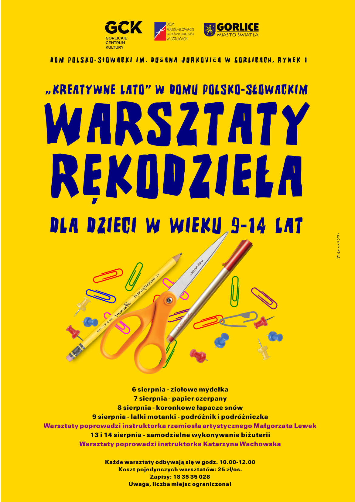 Plakat informujący o warsztatach rękodzieła dla dzieci w wieku 9-14 lat, które zorganizowane zostały w Domu Polsko-Słowackim w dniach od 6 do 14 sierpnia 2019 roku.