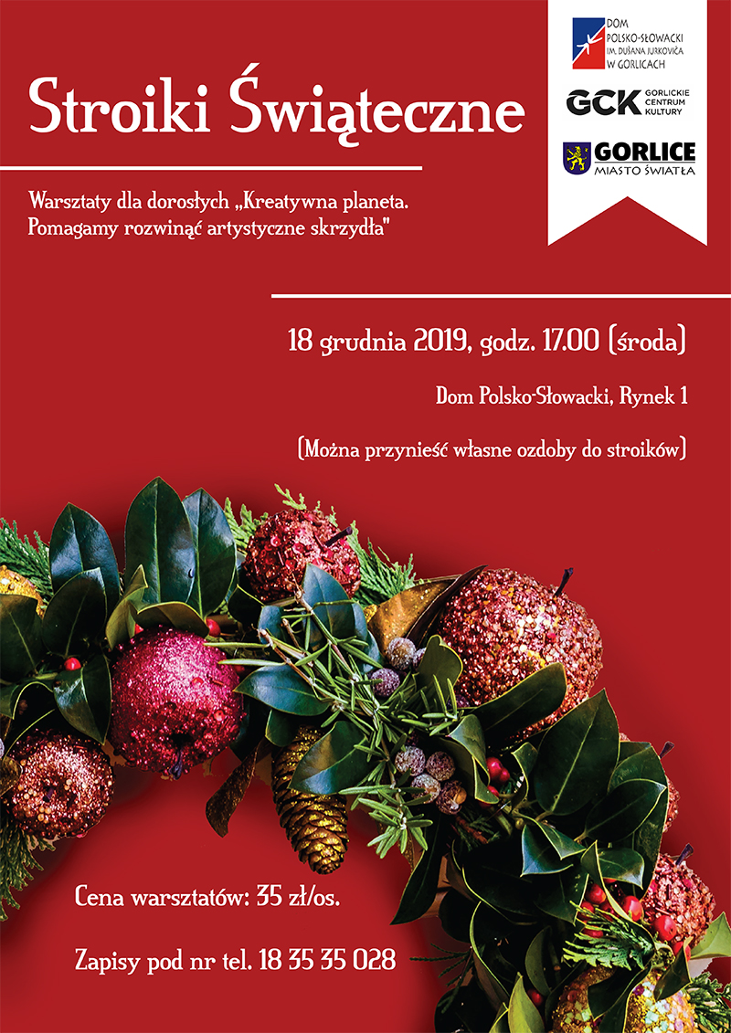 Plakat informujący o warsztatach dla dorosłych, które odbyły się w Domu Polsko-Słowackim 18 grudnia 2019 roku.