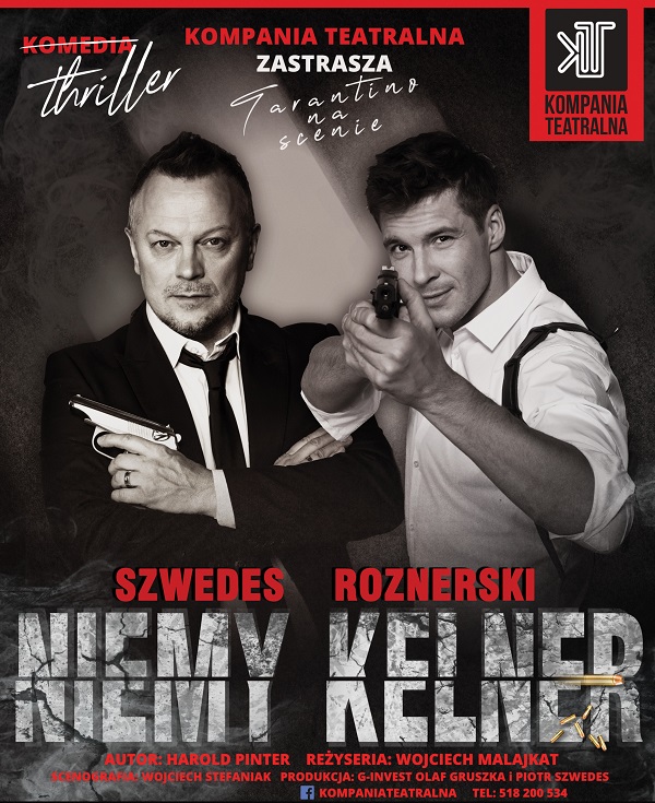 Plakat informujący o spektaklu teatralnym "Niemy kelner", który odbył się 14 lutego 2020 roku w Gorlickim Centrum Kultury.