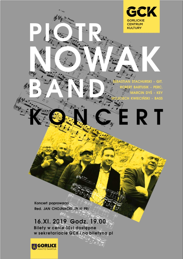 Plakat informujący o koncercie zepołu Piotr Nowak Band, który odbył się 16 października 2019 roku w Gorlickim Centrum Kultury.
