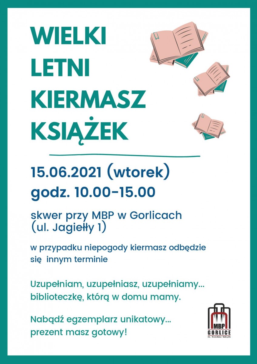 Plakat informujący o letnim kiermaszu książek, zorganizowanym przez Miejską Bibliotekę Publiczną w Gorlicach w dniu 15 czerwca 2021 roku.