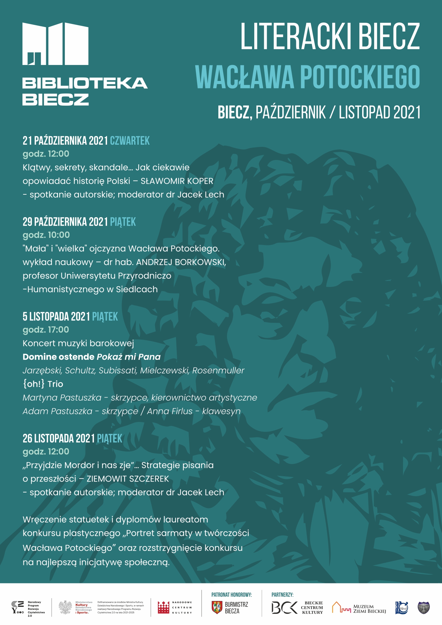 Plakat informujący o wydarzeniach kulturalnych zorganizowanych w październiku i listopadzie 2021 roku w Bibliotece w Bieczu.