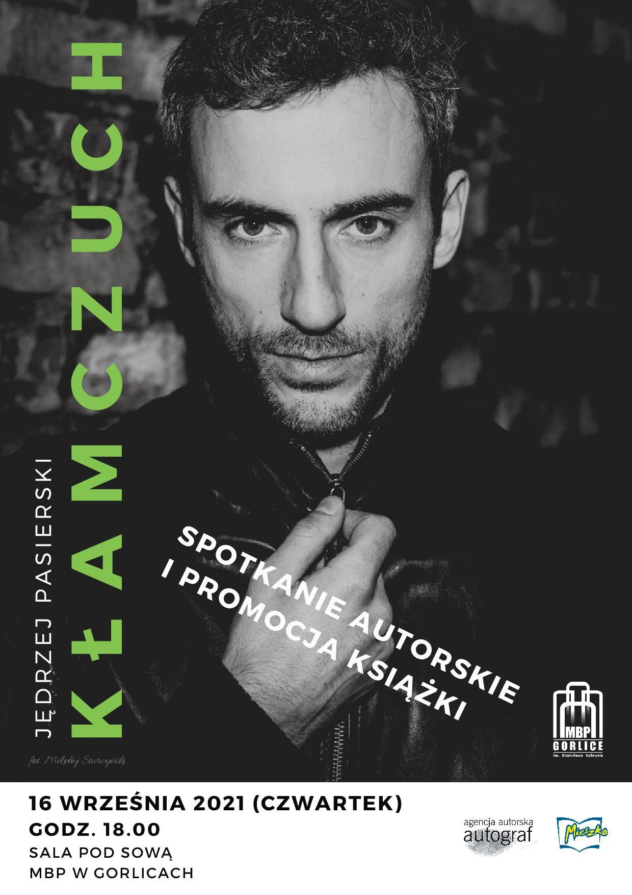 Plakat informujący o spotkaniu autorskim i promocji książki "Kłamczuch" Jędrzeja Pasierskiego, które odbyło się 16 września 2016 roku w Miejskiej Bibliotece Publicznej w Gorlicach.