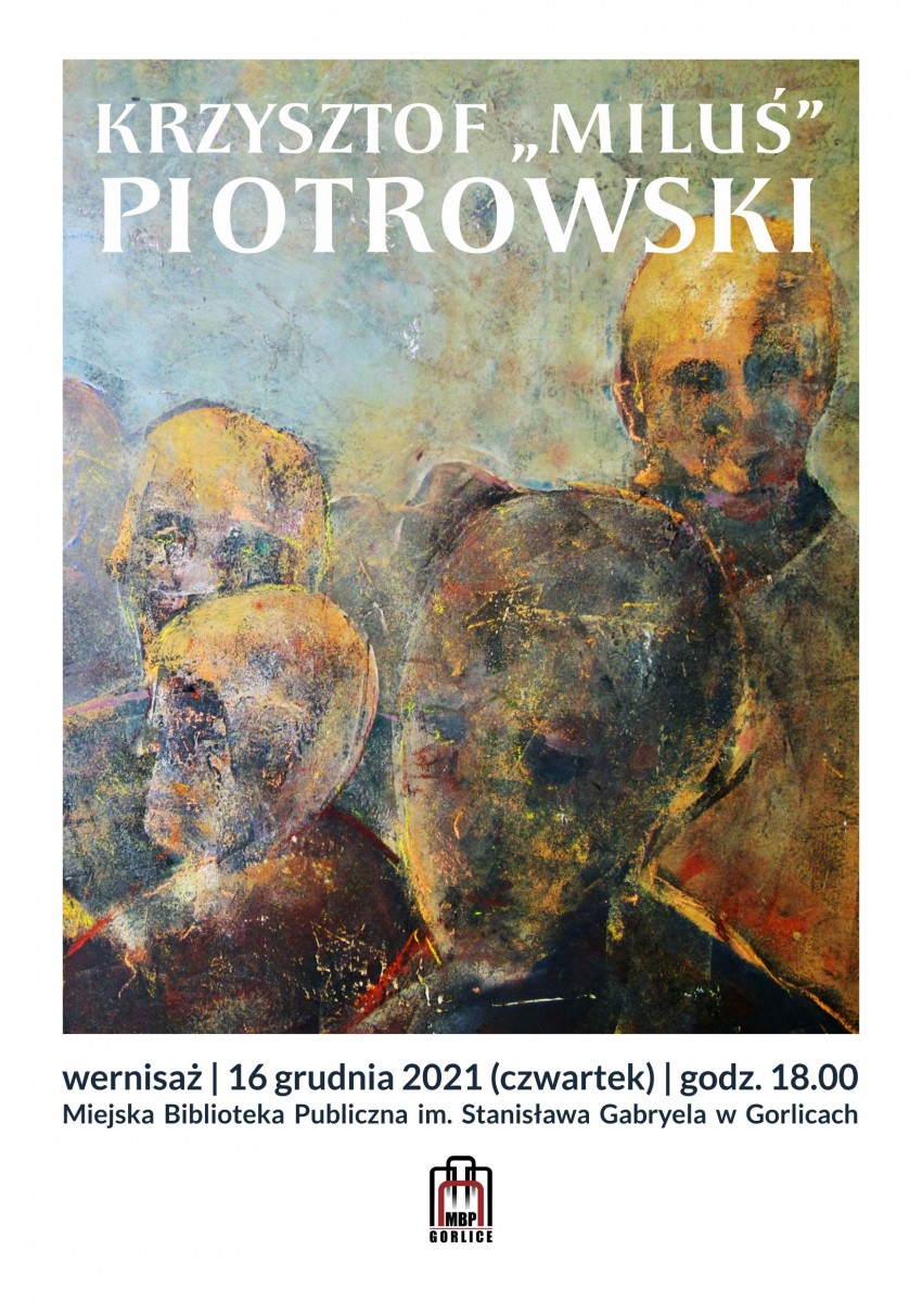 Plakat informujący o wernisażu wystawy Krzysztofa "Miluś" Piotrowskiego, który odbył się 16 grudnia 2021 roku w Miejskiej Bibliotece Publicznej w Gorlicach.