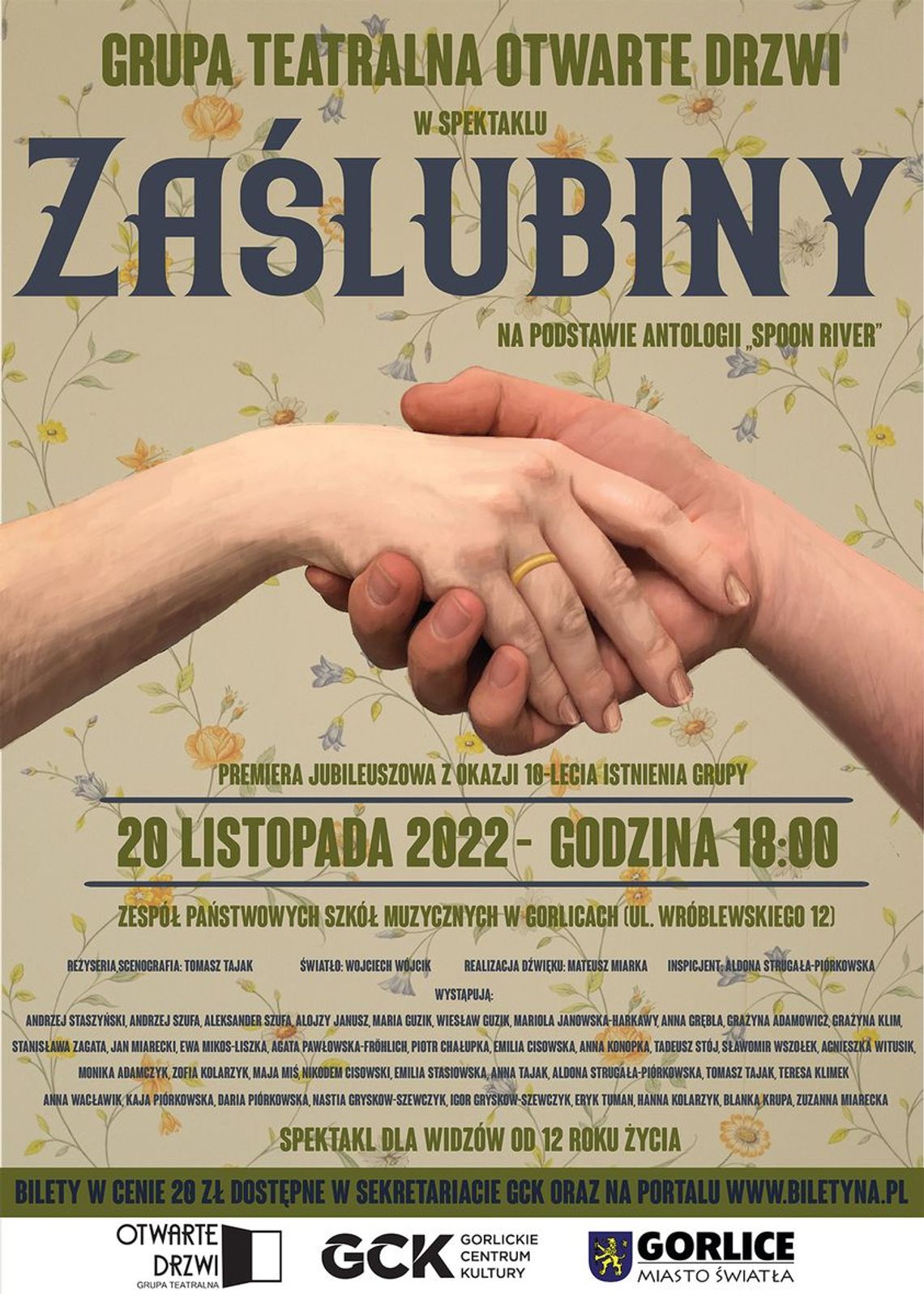 Plakat informujący o spektaklu teatralnym grupy Otwarte Drzwi, który odbył się 20 listopada 2022 roku w Państwowej Szkole Muzycznej w Gorlicach.