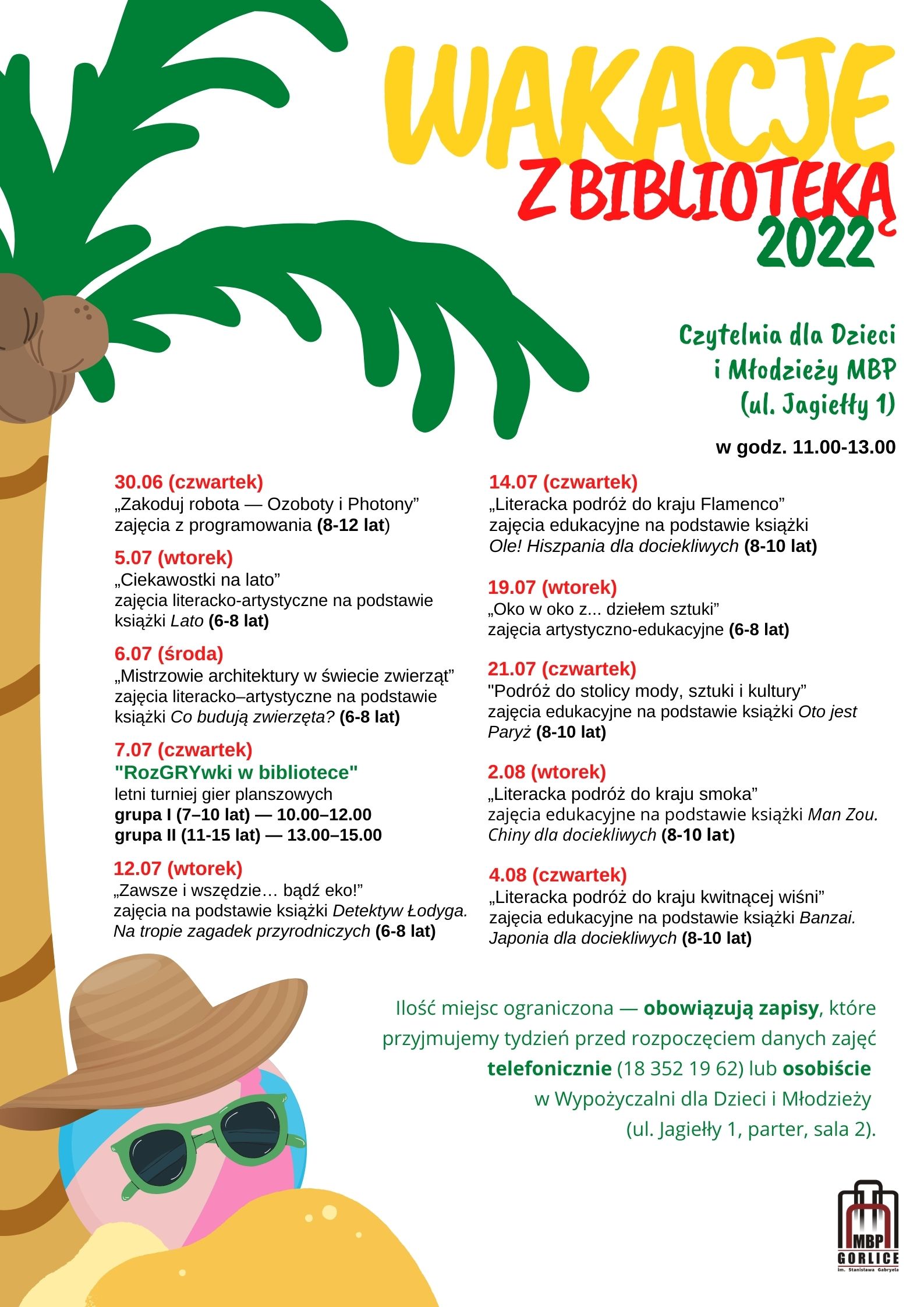 Plakat informujący o zajęciach, które odbywały się w MBP w Gorlicach w okresie wakacji w 2022 roku.