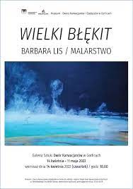 Plakat informujący o wystawie malarstwa Barbary Lis pt."Wielki błękit", która miała miejsce w dniach 14 kwiecień - 11 maj 2022 roku w Muzeum Dwory Karwacjanów i Gładyszów w Gorlicach.