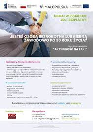 Plakat informujący o projekcje „AKTYWNOŚĆ NA TAK!” jest realizowany w ramach Regionalnego Programu Operacyjnego Województwa Małopolskiego na lata 2014-2020, 8 Oś Priorytetowa Rynek pracy, działanie 8.2 Aktywizacja zawodowa na podstawie umowy nr rpmp.08.02.00-12-0170/20-00 zawartej z Wojewódzkim Urzędem Pracy w Krakowie w dniu 26.02.2021.