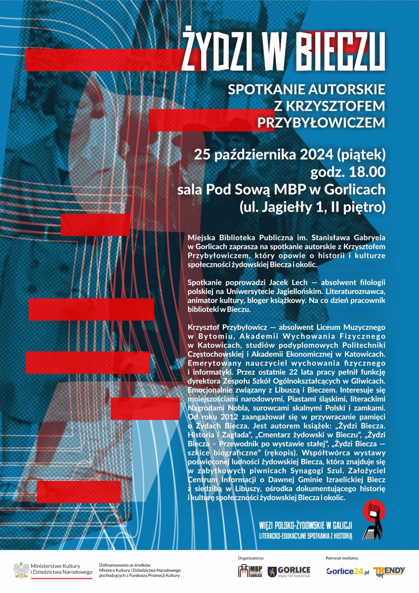 Plakat informujący o spotkaniu autorskim z Krzysztofem Przybyłowiczem pt. "Żydzi w Bieczu", które odbyło się 25 pażdziernika 2024 roku w Miejskiej Bibliotece Publicznej w Gorlicach.