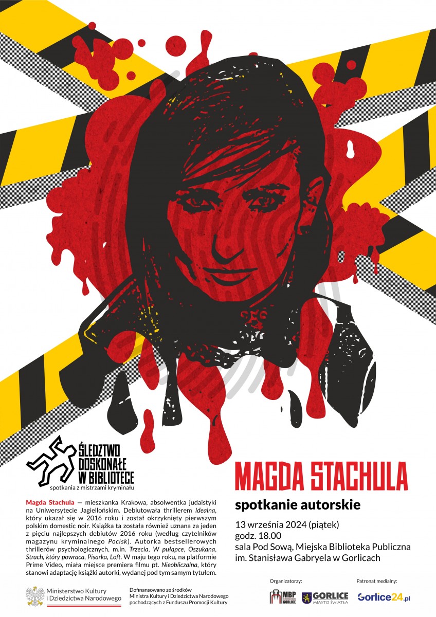 Plakat informujący o spotkaniu autorskim z Magdą Stachulą, które odbyło się 13 września 2024 roku w Miejskiej Bibliotece Publicznej w Gorlicach.