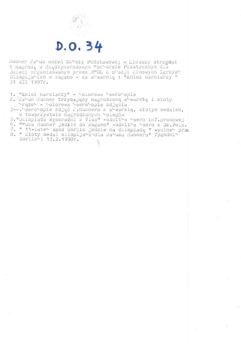 Huebner Jakub uczeń Szkoły Podstawowej w Libuszy otrzymał 1 nagrodę w Międzynarodowym Konkursie Plastycznym dla dzieci organizowanym przez MKOL z okazji Zimowych Igrzysk Olimpijskich w Nagano - za akwarelę : "Anioł narciarzy" - 31 XII 1997 r. Teczka zawiera kserokopie artykułów, zdjęcia dotyczących tego wydarzenia.