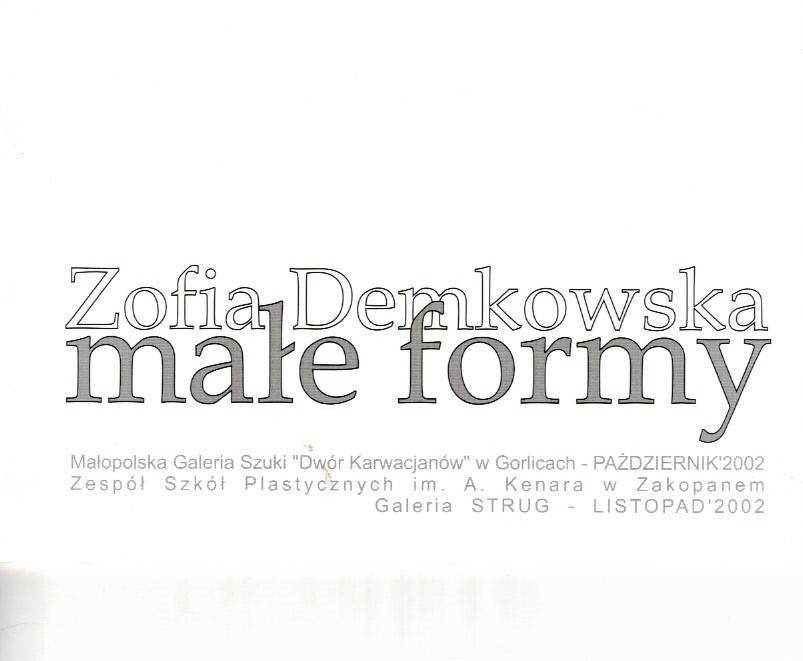 Małe formy / Zofia Demkowska. - Gorlice : Małopolska Galeria Sztuki Dwór Karwacjanów, 2002. - [17] stron : fotografie ; 15 cm.