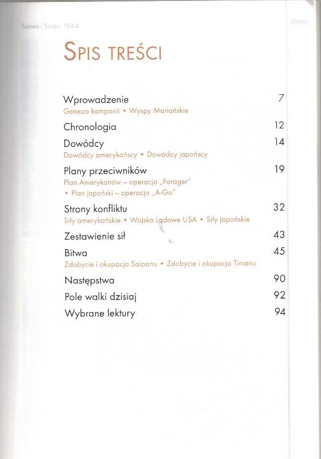 Inwazja na Saipan była pierwszą amerykańską operacją desantową w II wojnie światowej, przeprowadzoną siłami dwóch dywizji. Saipan i Tinian znajdowały się pod kontrolą Japonii od 1914 r. Uważano je, w praktyce, za część imperium japońskiego, liczna była więc grupa mieszkających tam Japończyków. Walki o obie wyspy charakteryzowały się samą zaciekłością, z jaką spotkali się żołnierze sojuszniczy podczas wszystkich pozostałych starć na Pacyfiku. Walczący ramię w ramię żołnierze armii i piechoty morskiej, uczestniczyli w największej bitwie pancernej, jaka miała miejsce na pacyficznym obszarze działań, odparli zmasowane szarże banzai, byli świadkami samobójstwa setek japońskich cywilów, wolących śmierć od znalezienia się pod władzą Amerykanów. Autor książki, Gordon Rottman, szczegółowo omawia w niej przebieg desantu na wyspy Saipan i Tinian, których zdobycie doprowadziło do upadku rządu premiera Hideki Tojo.