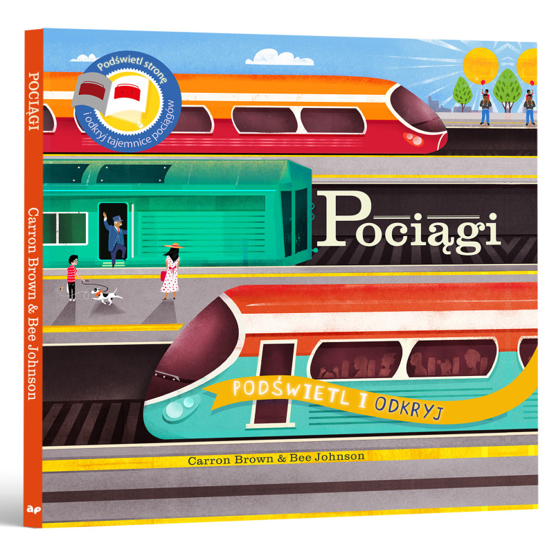Na okładce: Podświetl stronę i odkryj tajemnice pociągów.