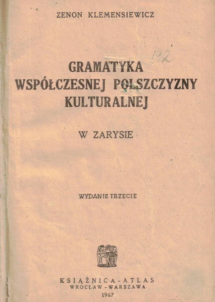 Gramatyka współczesnej polszczyzny kulturalnej w zarysie / Zenon Klemensiewicz. - Wydanie trzecie. - Wrocław ; Warszawa : Książnica Atlas, 1947. - 179 stron : ilustracje ; 21 cm.