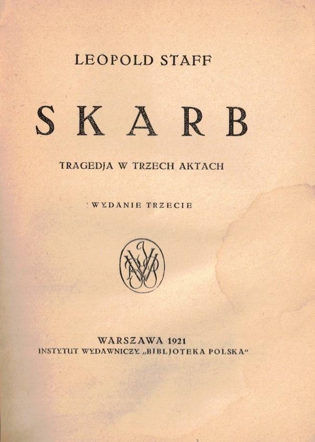 Skarb : tragedia w 3 aktach / Leopold Staff. - Wydanie trzecie. - Warszawa : Instytut Wydawniczy "Biblioteka Polska" 1921. - 192, [2] strony ; 16 cm.