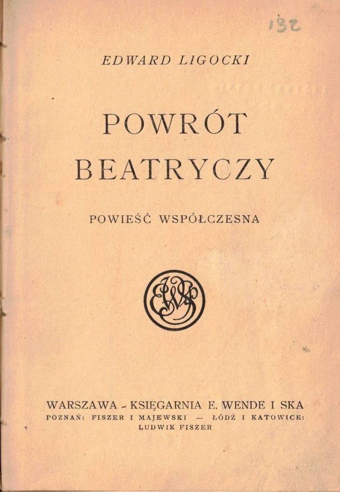 Powrót Beatryczy : powieść współczesna / Edward Ligocki. - Warszawa : Księgarnia E. Wende i S-ka ; Poznań : Fiszer i Majewski ; Łódź ; Katowice : Ludwik Fiszer, [1925]. - 208 stron ; 18 cm.