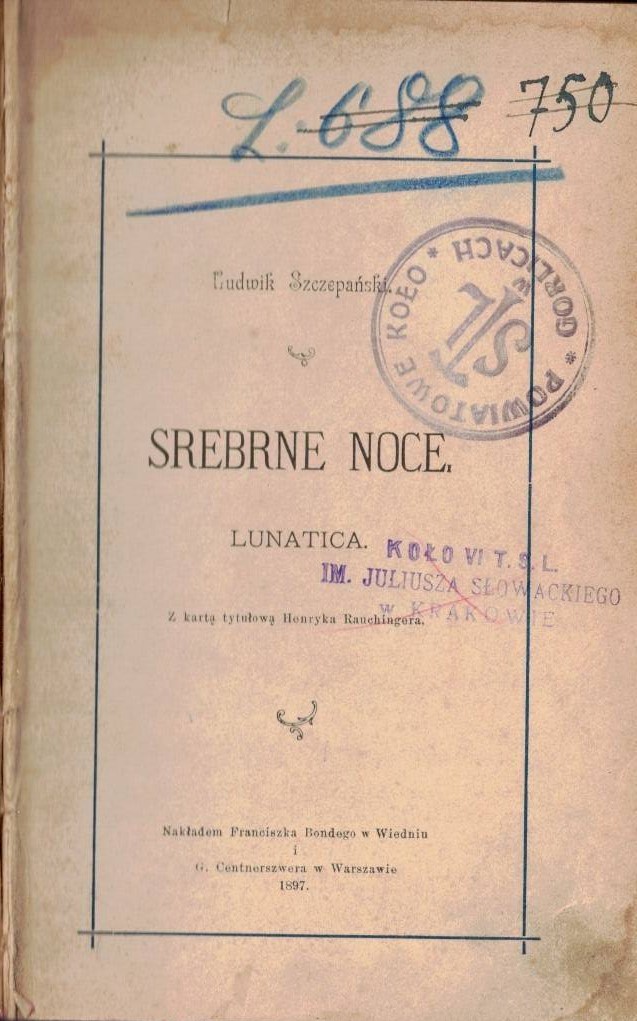 Srebrne noce : lunatica. Hymny / Ludwik Szczepański. - Wiedeń ; Warszawa : F. Bondy ; G. Centnerszwer 1897 (Kraków : Drukarnia Narodowa F. K. Pobudkiewicza) ; (Wiedeń : Drukarnia Mechitarzystów). - 83 ; 50, [4] strony ; 18 cm.
