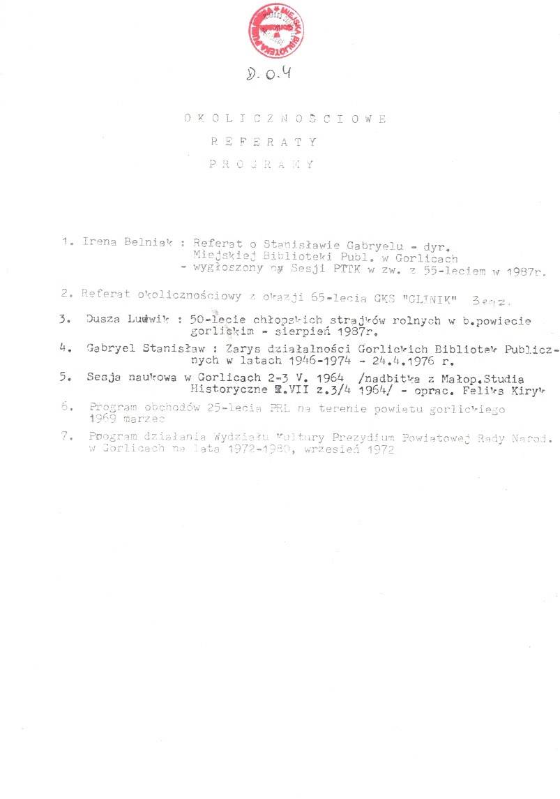 Teczka zawiera : referaty Ireny Belniak, Ludwika Dusza, Stanisława Gabryela, referaty z okazji 65 lecia GKS "Glinik" ; ksero Małopolskiego Studia Historycznego R. VII z. 3/4 1964 rok, program obchodów 25 lecia PRL na terenie powiatu gorlickiego marzec 1969 rok, program działalności Wydziału Kultury Prezydium Powiatowej Rady Narodowej w Gorlicach na lata 1972-1980, wrzesień 1972.