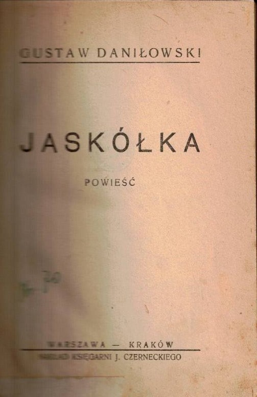 Jaskółka : powieść / Gustaw Daniłowski. - Kraków : J. Czernecki, [1920] (Kraków : Drukarnia Narodowa). - 346 stron ; 21 cm.