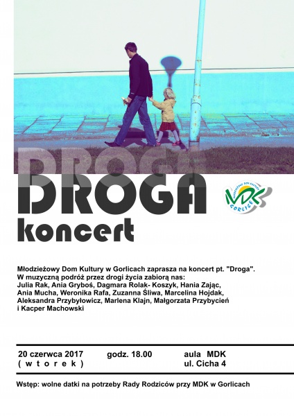 Plakat informujący o koncercie "Droga", jaki odbył się w Młodzieżowym Domu Kultury w Gorlicach w dniu 20 czerwca 2017 roku.