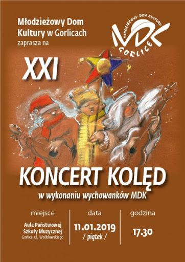 Plakat informujący o XXI Koncercie Kolęd w wykonaniu wychowanków MDK w Gorlicach, który odbył się 11 stycznia 2019 roku w Państwowej Szkole Muzycznej w Gorlicach.
