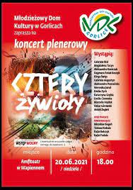 Plakat informujący o koncercie plenerowym "Cztery żywioły", który odbył się 20 czerwca 2021 roku w Młodzieżowym Domu Kultury w Gorlicach.