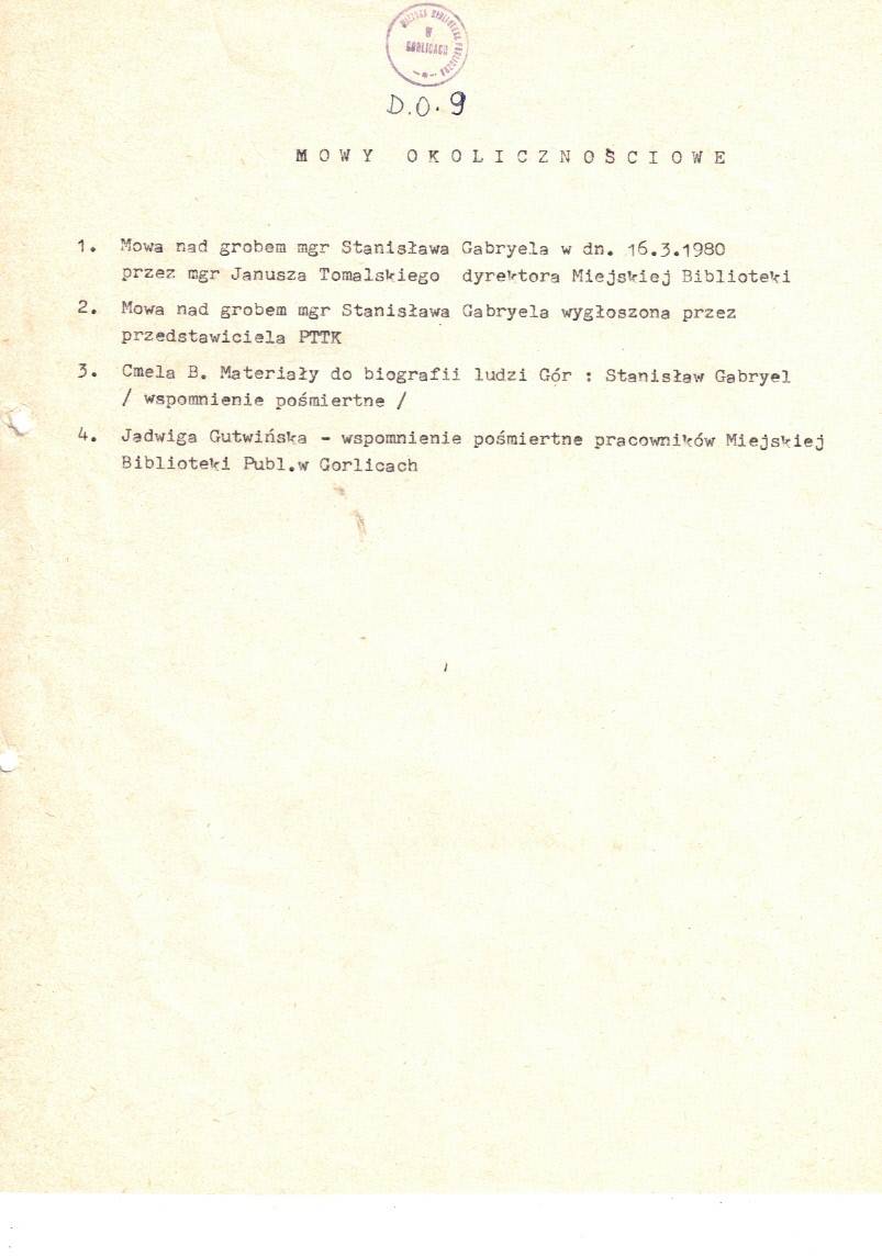 Teczka zawiera : Mowy nad grobem Stanisława Gabryela oraz bibliotekarki Jadwigi Gutwińskiej, folder jubileuszu XXX lecia MBP w Gorlicach, materiały do bibliografii ludzi gór : Stanisław Gabryel (wspomnienia pośmiertne).