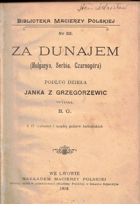 Za Dunajem : (Bułgarya, Serbia, Czarnogóra) / podług dzieła Janka z Grzegorzewic wydał B. G. - Lwów : Macierz Polska, 1904 (Kraków : W. L. Anczyc). - 389, [2] strony, 17 rycin, 1 mapa : ilustracje ; 18 cm.