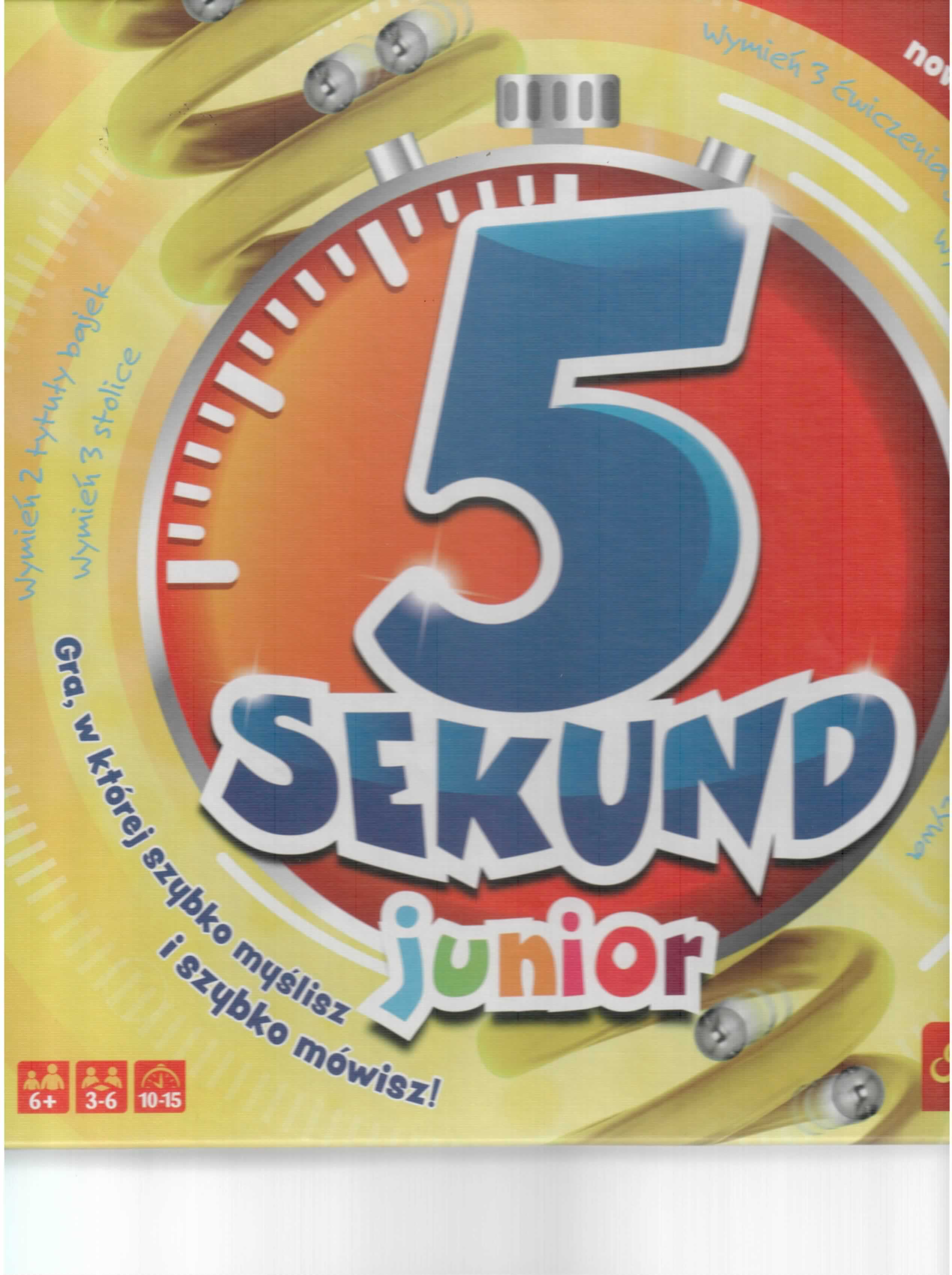 5 sekund : junior / opracowanie gry Paulina Kortas, Adam Bukowski, Jacek Zdybel, Bartosz Odorowicz. - Edycja specjalna - pytania stworzone przez dzieci i rodziców. - Gdynia : Trefl, copyright 2019. - 1 pudełko ; 26x26x8 cm.