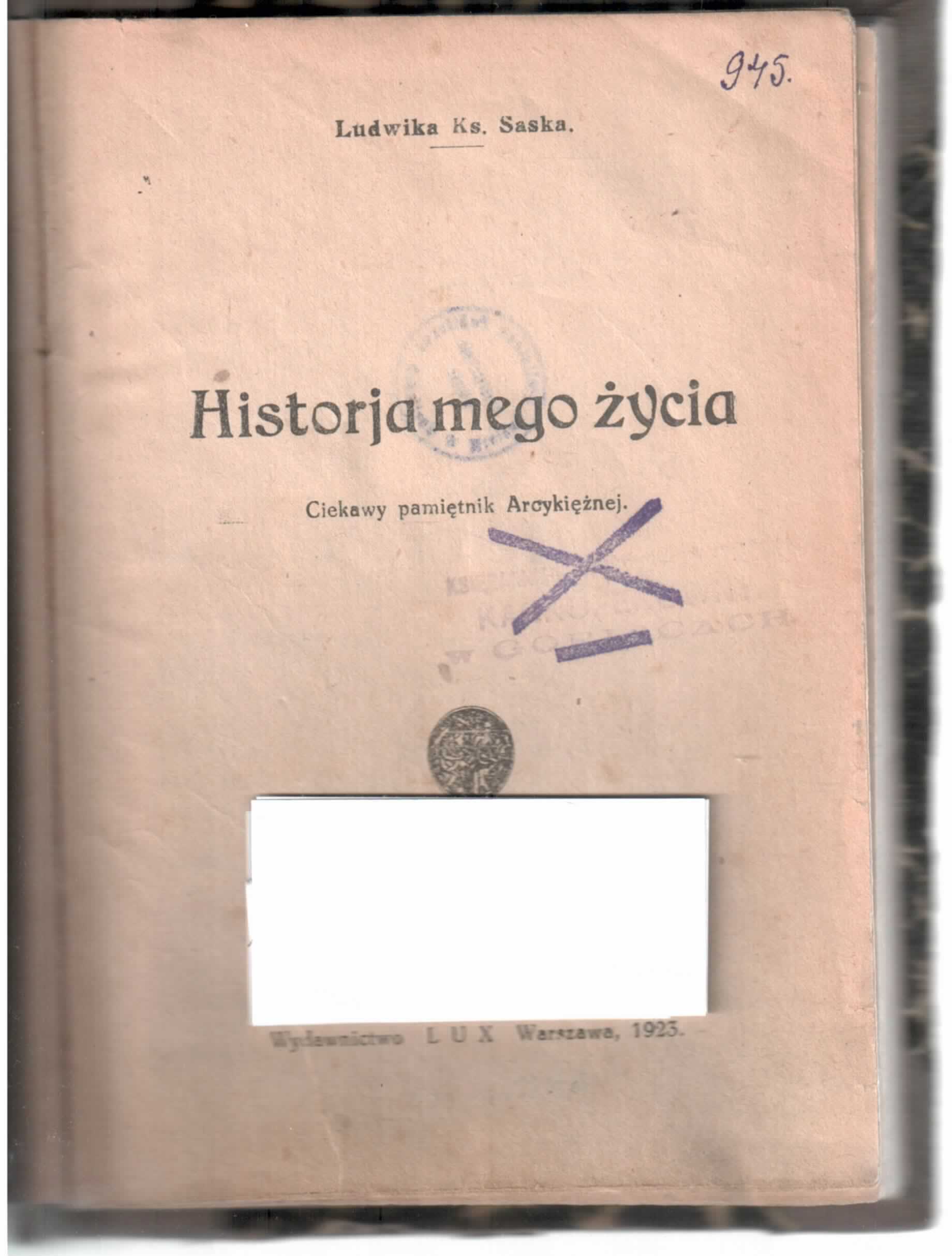Historja mego życia / Ludwika ks. Saska. - Warszawa : Wydawnictwo Lux, 1923 (Warszawa : Druk. "Rekord"). - 126 stron ; 18 cm.