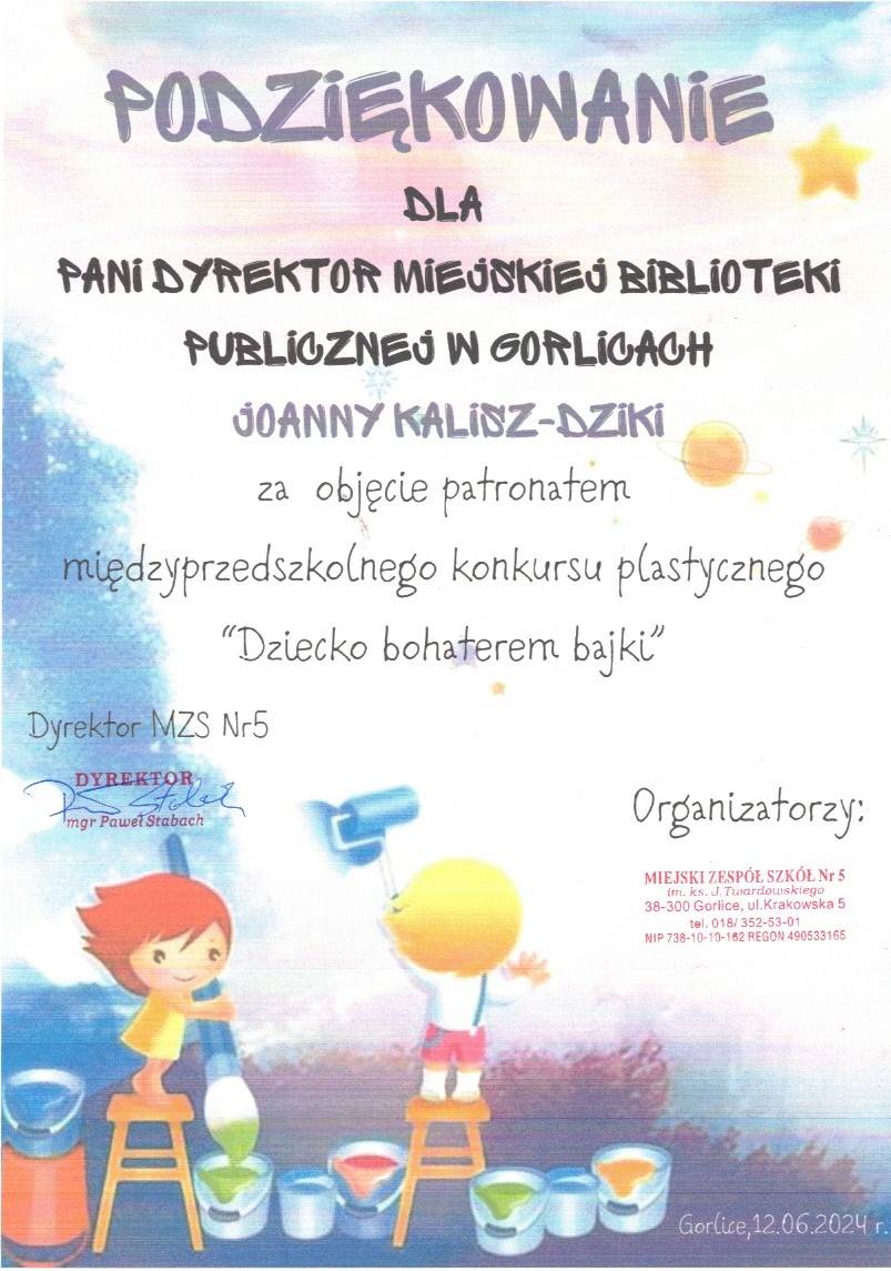 Podziękowanie za objęcie patronatem międzyprzedszkolnego konkursu plastycznego "Dziecko bohaterem bajki", którego organizatorem był Miejski Zespół Szkół nr 5 w Gorlicach.